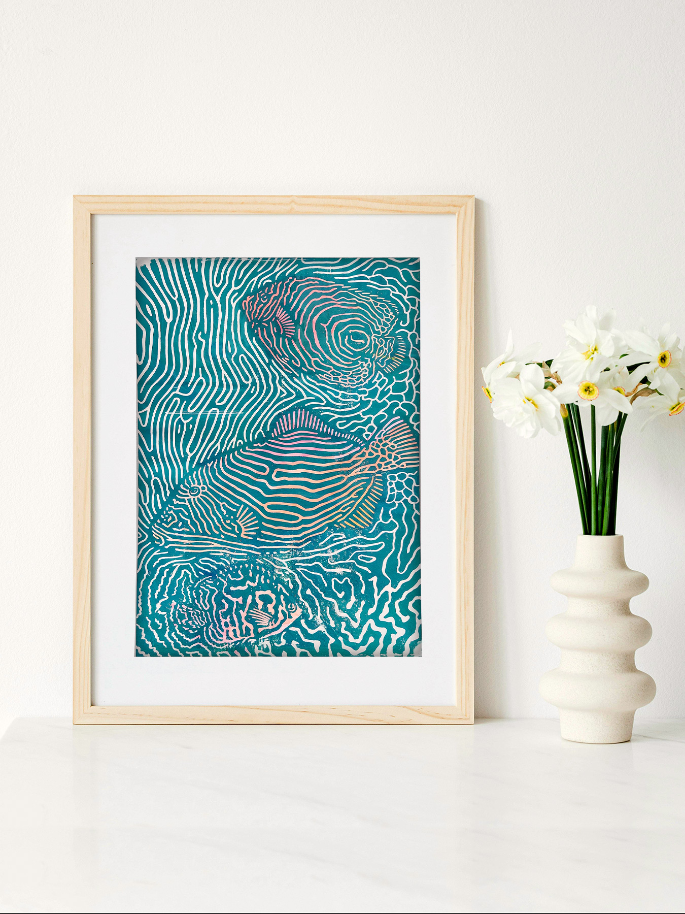 Einzigartig wie das Riff selbst – dieses A3-Kunstwerk kombiniert einen handgemalten Gouache-Layer mit einem Linoldruck, wodurch jedes Stück ein Unikat ist. Die limitierte Auflage von 12 Stück ist auf der Rückseite signiert und wird in Schutzfolie verpackt geliefert.